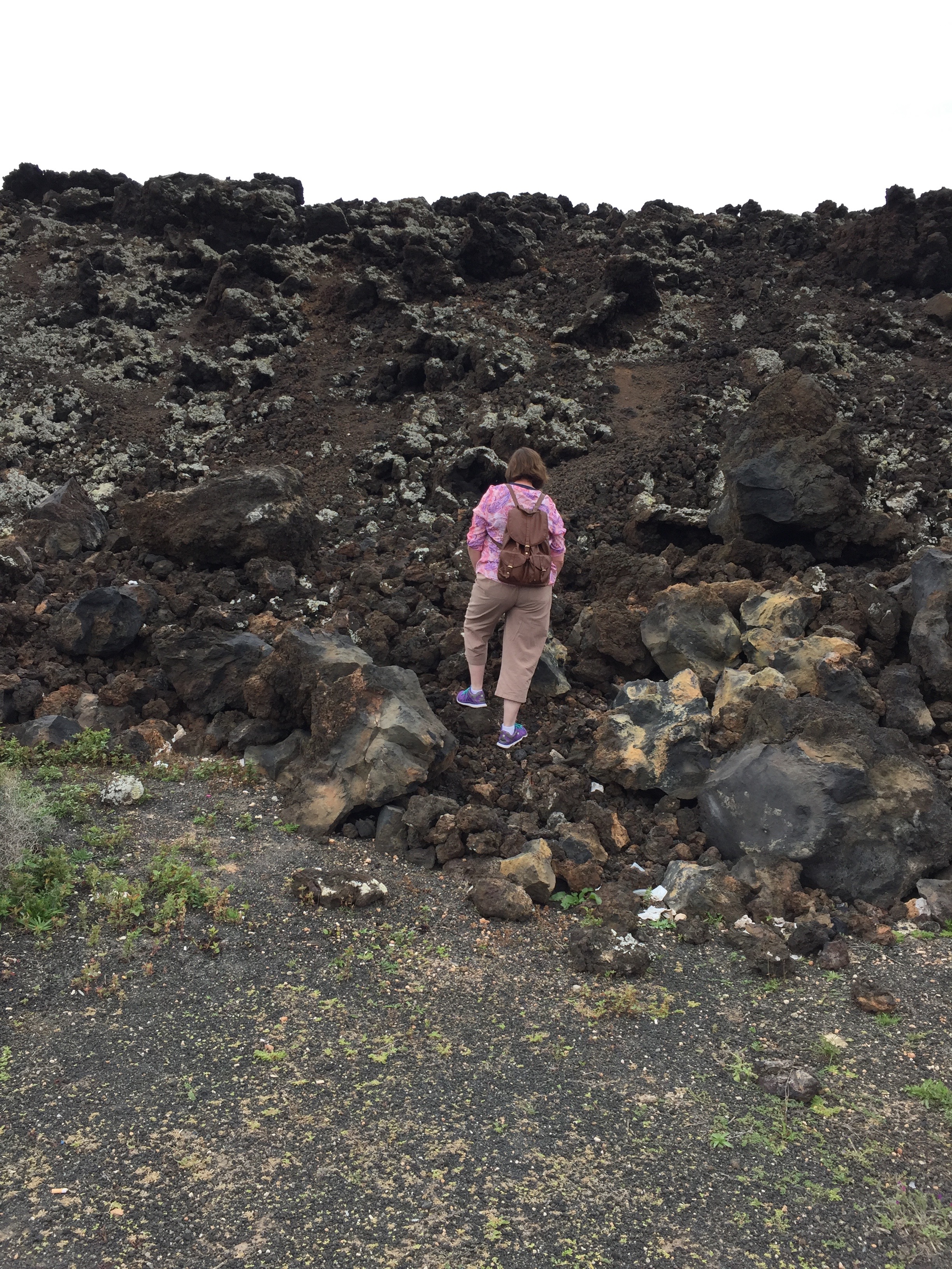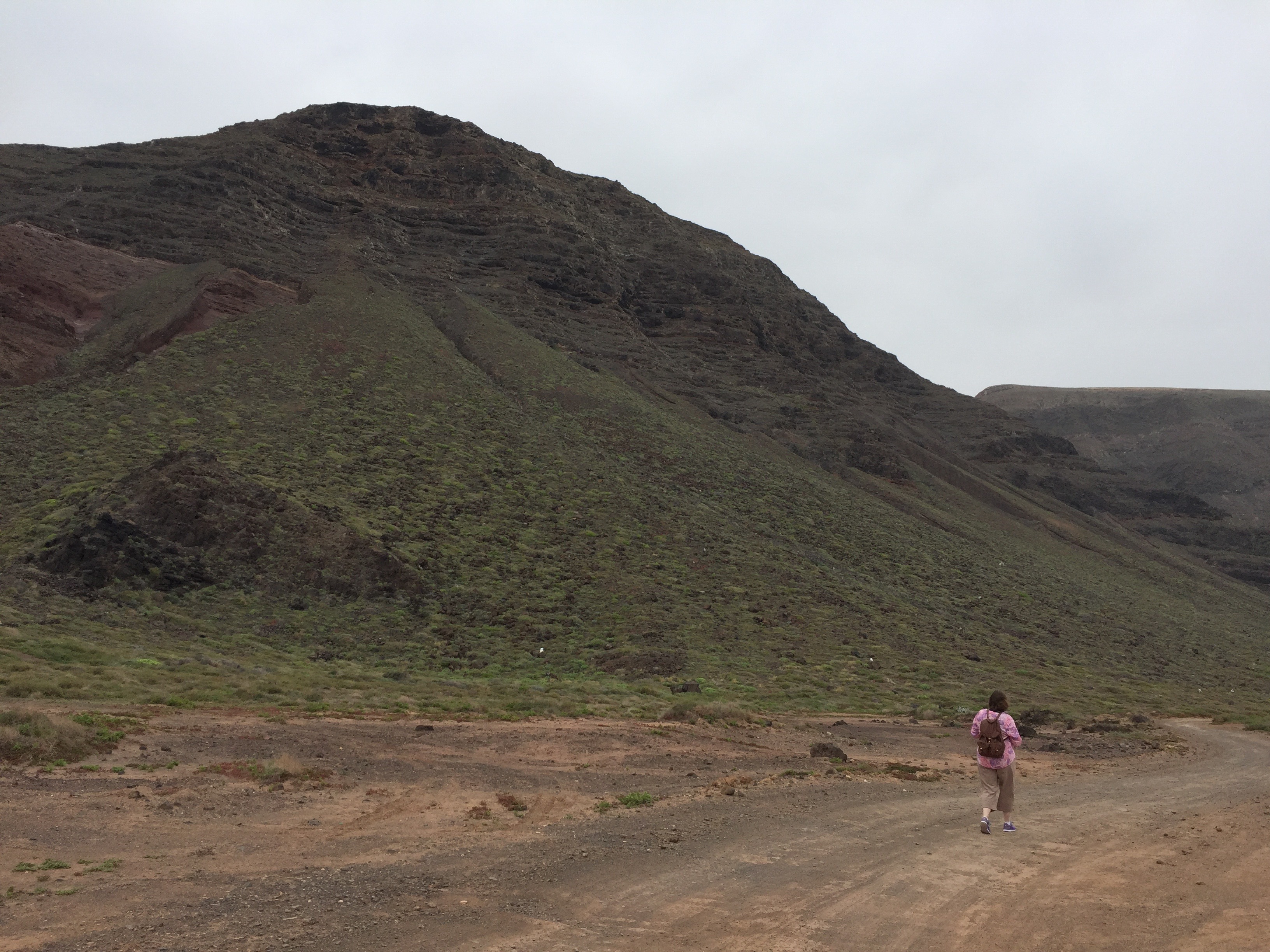 We set off, heading north to Ye, passing through a narrow valley between La Corona, the largest volcano in the chain, and the rounded peaks of the massif. The road is narrow and edged with low dry stone walls. Beyond, the fields of black were alive with euphorbias, the lichens on the rocks bright splodges of white, yellow and orange. Wild grasses and flowers everywhere, the result of recent rain. Usually, there is little green save what the farmers plant and tend.