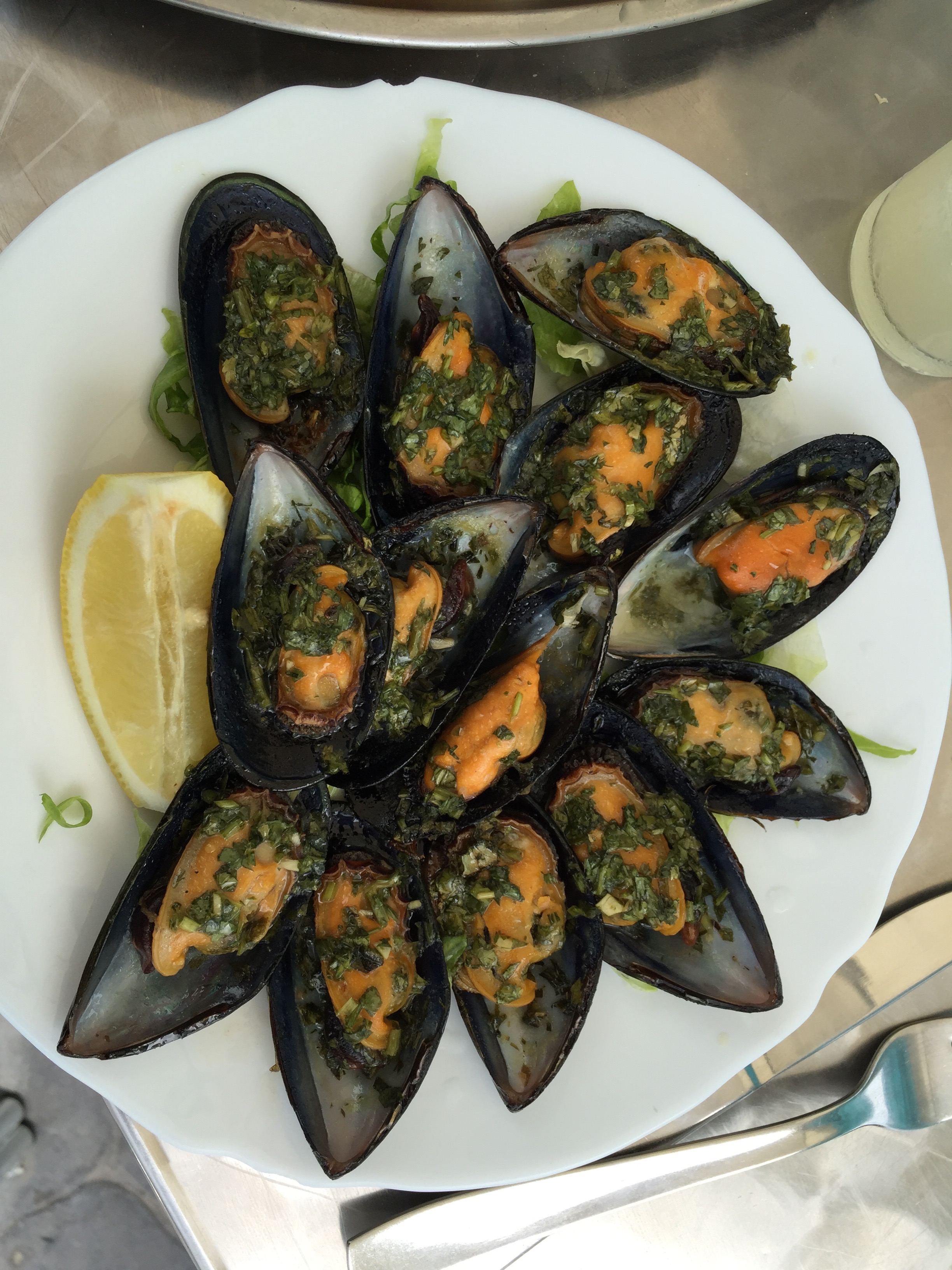 We completed our adventure with lunch beside the little wharf in Arrieta, choosing a restaurant with Spanish-speaking diners. We didn’t speak much. Both of us watched the ocean break on the low cliff to the south, sending up gushes of spume. Although I did comment on the fish I ordered, for it was the best fish I have eaten in a long time. And Michelle tells me her mussels were fine.