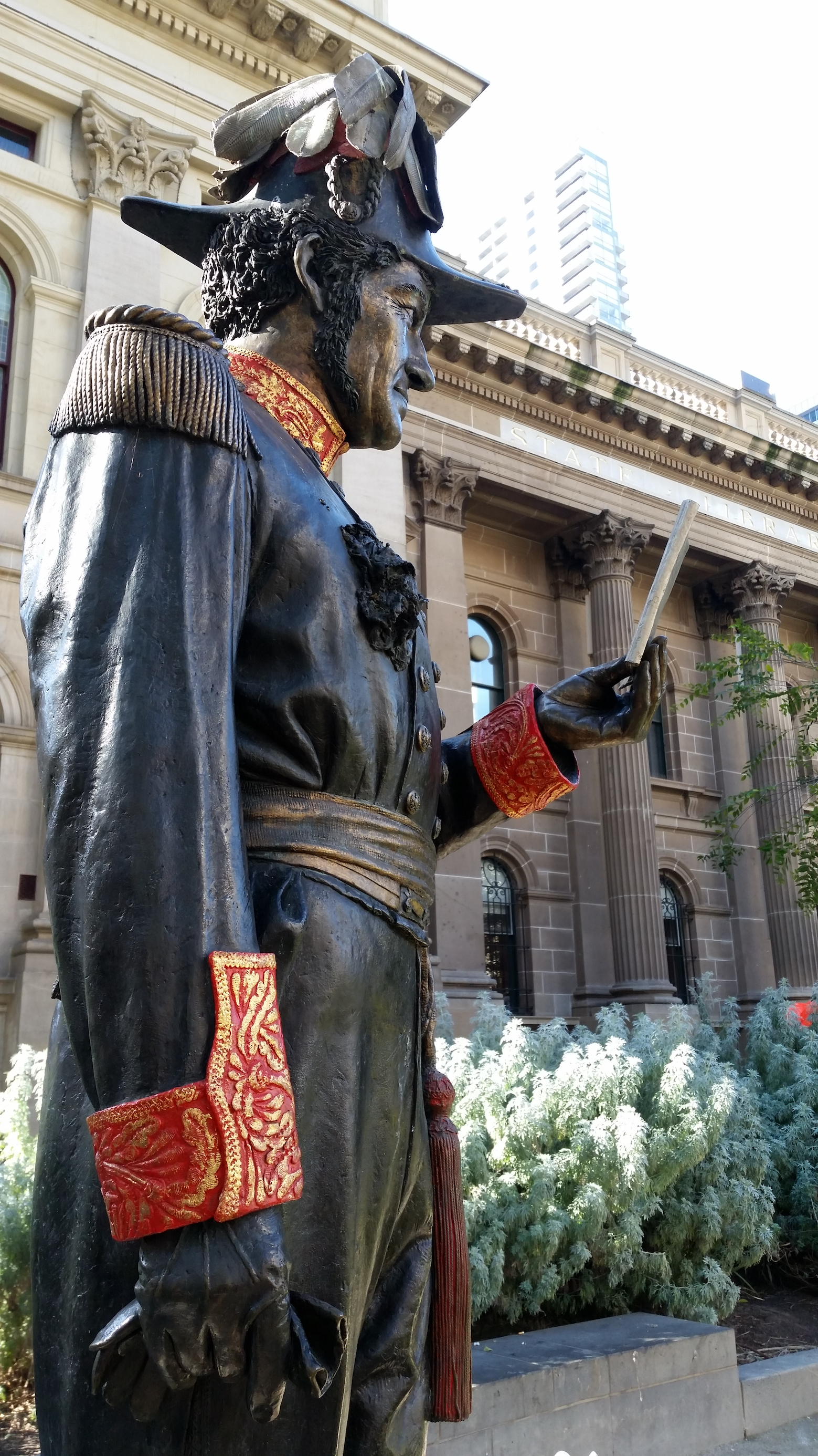 To start my little tour, I went to stand by the statue of Victoria’s first governor. Charles La Trobe is a member of the aristocratic La Trobe-Bateman family. He and his cousin, book illuminator and garden designer Edward La Trobe, both came to Australia in the 1800s, while the rest of the family remained in Britain. It was Charles La Trobe’s idea to have a public library built in Victoria. His statue depicts him in glorious fashion, the sculptor obviously wanting to appeal to the governor’s vanity. Other artists have been less kind, as can be seen on the front cover of his newly published biography, LaTrobe:traveller, writer, governor, composed by John Barnes, Professor of English at La Trobe University.