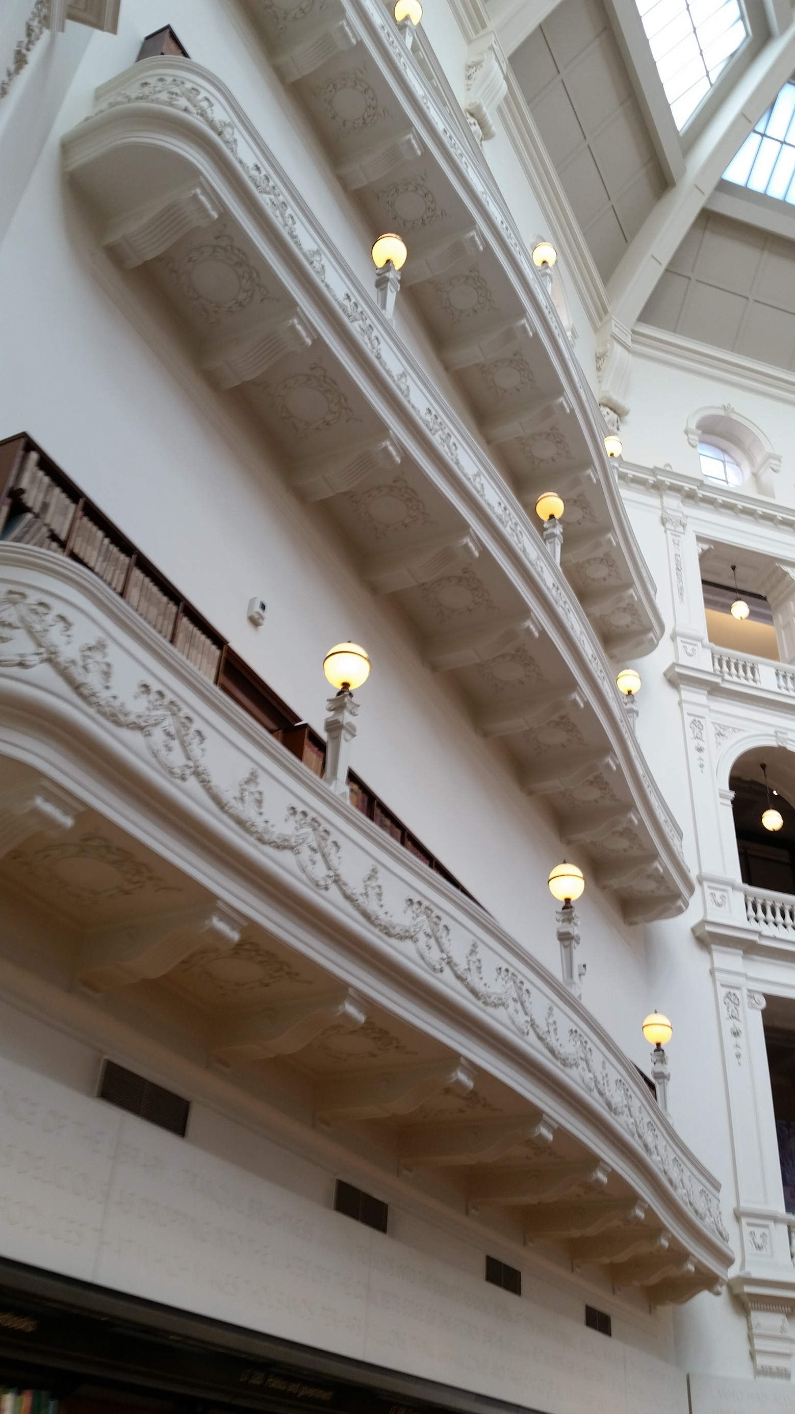 Inside, the library was filled with readers. Most had their heads bent over a book. The cavernous room absorbed much of the sound but the room lacked the hushed quality I was looking for. I headed straight on through to admire the Redmond Barry Reading Room, a later addition to the original building. There too, every desk was occupied, but readers were more subdued and the magnificence and architectural uniformity of the mezzanine, and the glass-covered atrium, seemed to quieten the spirits. Here was not a room to rush around in, and my own footsteps on the polished wooden floor seemed overly loud!