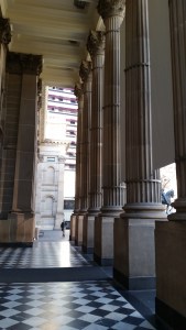 From my vantage beside the statue I took in the library in all its grandeur. It’s impossible not to be impressed with the building, designed by Joseph Reed in Roman Revival style. It was officially opened in 1856, although not in its current form. The building is constructed from Tasmanian freestone, replete with rounded arched windows, and Ionic fluted columns on the portico. I admired the checkerboard tiled floor, which seemed to mirror the chess games being played, large scale, out on the grounds.