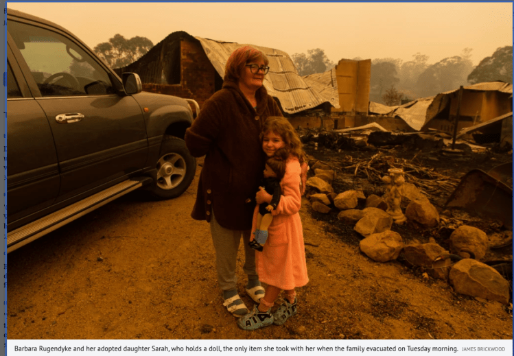 We need to face the horror of this and stamp it into our brains. These monster fires are capable of burning through the night traversing 24km in about 6 hours as though by stealth. These fires create firestorms that roar at you like a steam train, they hurl “embers” (read little fire bombs) many kilometres, they suck the oxygen out of the air, they create their own weather including lightning and tornadoes; these fires have been caused by climate change.
