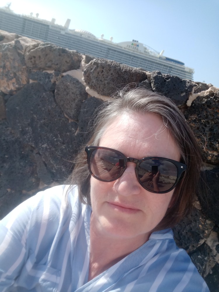 Some guys in a van were setting up music so I sat and listened to Canary Island tunes, caught a little sun and enjoyed the view of the rather grand Palacio de Formación y Congresos de Fuerteventura – that big dark-grey building in the photo above – and the distant mountains, and I marvelled at this wonderful unassuming little city of Puerto del Rosario. I even took a selfie, replete with the ship.