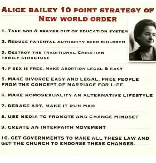 It should be noted that there is no ten point plan or strategy in the Bailey teachings and not one single point listed in the graphic below was ever promoted by Alice Bailey, herself a devoted Christian who never relinquished her faith in favour of Theosophy.