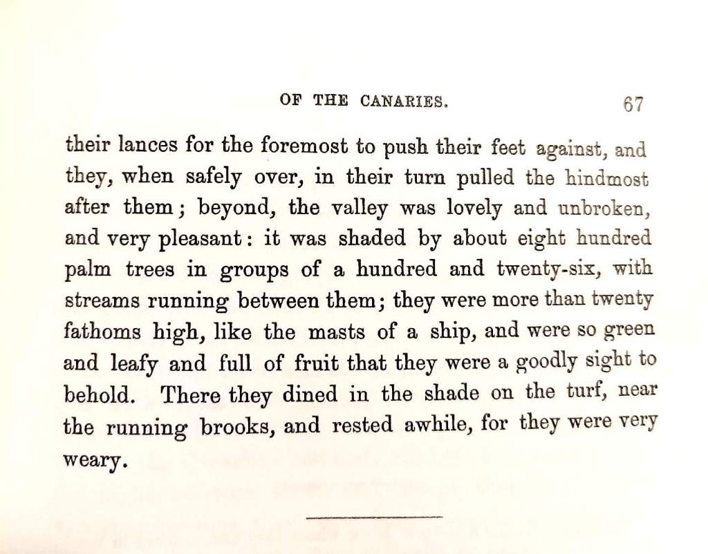 …there were trees and natural springs and rivers in the valleys. It’s hard to imagine today. So I have uploaded an extract from The Canarian, written by monk Pierre Bontier and priest Jean le Verrier, two members who journeyed with Juan Bethencourt on his conquest of the Canary Islands.